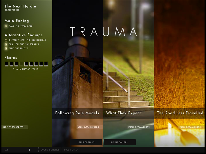 Bir de travma sonrası oluşanlar, daha da absürt hale gelebilirler. Hayatın insana yaşattıkları ve çözüm yolları, ilginç objelerle oyunda sembolize edilmiş. Örneğin, “The Next Hurdle” başlıklı rüyaya girdiğinizde, bir ağırlığın altında ezilmiş bir oyuncak ayı göreceksiniz. Bu rüyada, hayatta kaybolup giden çocukluğun betimlemesini bulacaksınız. “Following Role Models” rüyasında, kahraman sandığınız ama tanıyınca hiç de öyle olmadığını gördüğünüz insanların; “What They Expect” rüyasındaki sürekli başladığı yere dönen yol gibi, hayatın çıkmazlarının; “The Road Less Traveled” rüyasında ise diğerlerinin istekleri ile kendi isteklerinizin çakışması durumunda yaşanan çıkmazın betimlemelerini bulacaksınız.
